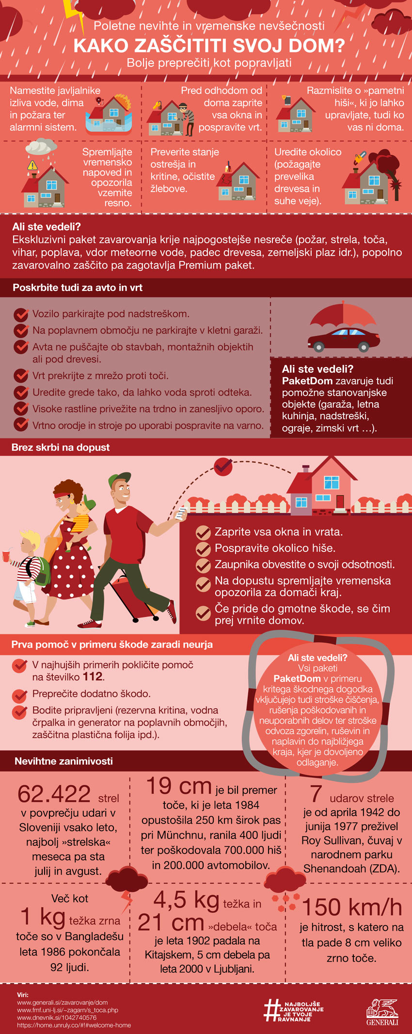 Na vremenske spremembe moramo biti pripravljeni z ustrezno infrastrukturo, z zavarovanjem nepremičnin in premičnin ter predvsem odgovornim ravnanjem. Pravočasna priprava je ključna, saj je – kot pravi pregovor – bolje preprečiti, kot popravljati. Za konec še nekaj splošnih nasvetov za zaščito doma.